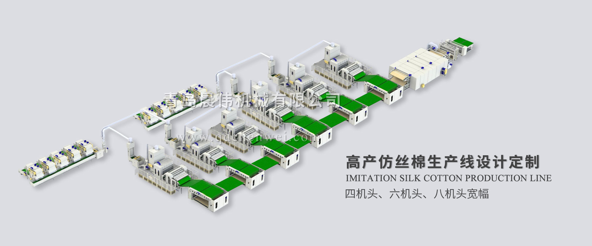 青島晨偉機械有限公司 專業設計定制各類無紡布單機設備及生產線。 我公司主要產品:電子秤重開包機、開松機、給棉機、氣壓棉箱、(高速)單錫林雙道夫梳理機、(高速)雙錫林雙道夫梳理機、鋪網機、中速針刺機、高速針刺機、烘箱/烘房、燙光機、熱軋機、收卷切片機,無紡布設備、仿絲棉設備、防塵布設備、噴膠棉設備、無膠棉設備、硬質棉設備、土工布設備生產線、椰棕床墊生產線、大棚保溫被生產線、蠶絲被生產線、床上用品設備等各種無紡布機械設備。